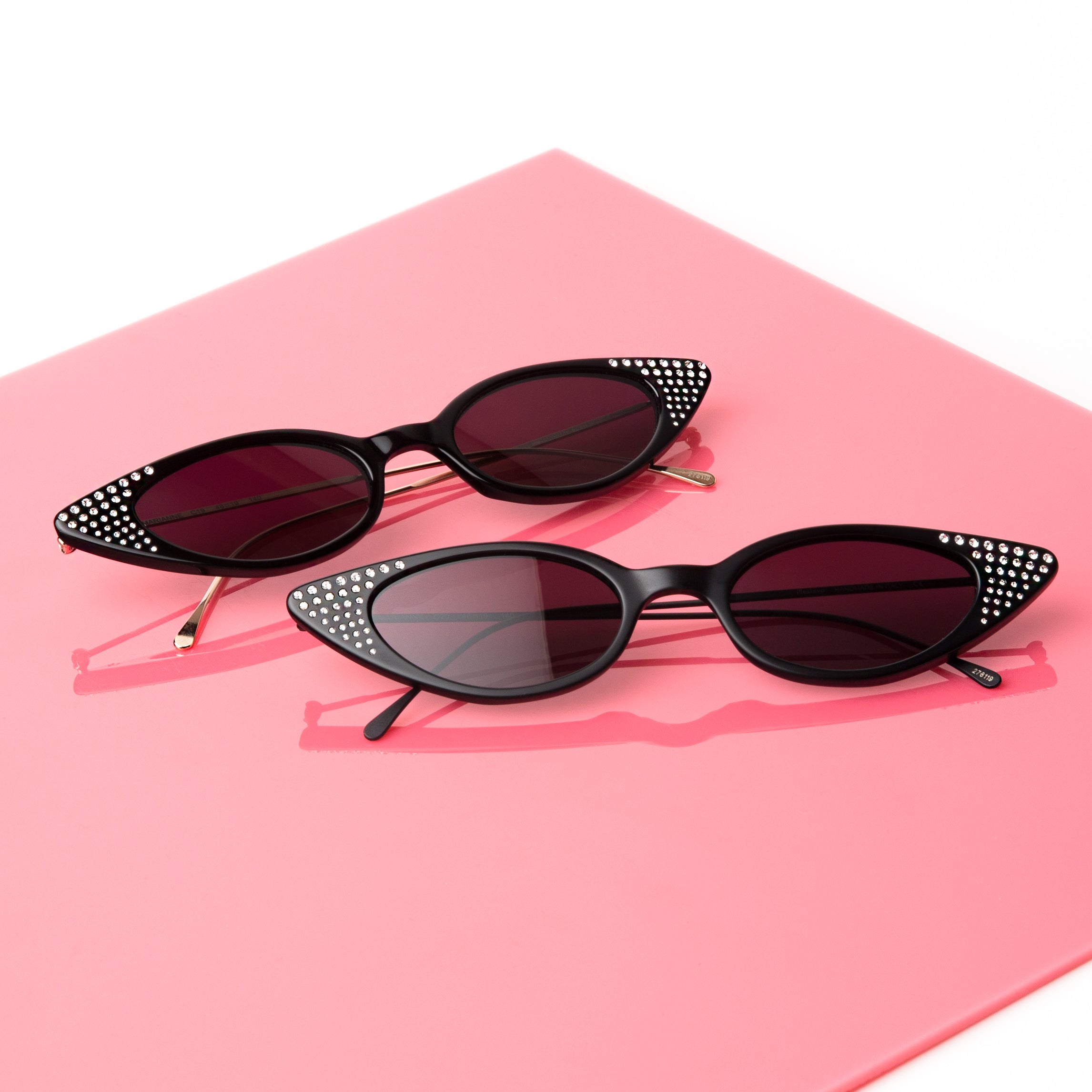 This pair of women's sunglasses rhymes with femininity and style but has a sense of fun and wit because of its exaggerated cat-eye frame and elegance because of its gold stainless steel temples with filigree.